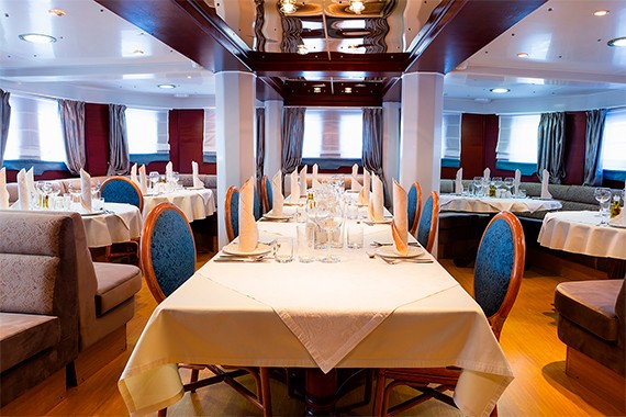 Ресторан специализируется на блюдах сибирской и байкальской кухни. Северные регионы радуют гостей необычными деликатесами. В меню входят морские омули и лосось. Для приготовления блюд мы используем свежие продукты, которые доставляются на борт перед началом круиза. А в уютном баре гости могут заказать чай, кофе и алкогольные напитки.