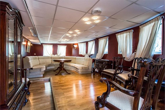 На борту все учтено до мельчайших деталей, чтобы обеспечить гостям теплохода максимальный комфорт и безопасность. Просторная открытая палуба, уютный салон, теплые цвета интерьеров кают — все здесь предназначено для Вашего приятного и беззаботного отдыха. Высокопрофессиональный экипаж и обслуживающий персонал позаботятся о Вас. Также на теплоходе имеются: ресторан, вместимостью 45 человек, бар, сауна, бассейн, открытая палуба, ТВ,