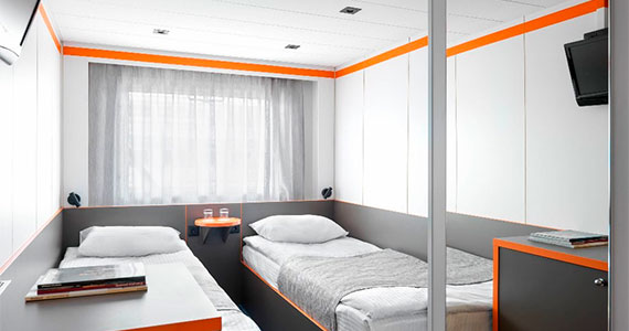 Однокомнатная одноярусная каюта, рассчитанная на размещение двух человек. В каюте: две односпальные кровати, холодильник, минибар, сейф, телевизор, шкаф для одежды, радио, обзорное окно, душ, санузел, кондиционер, фен, электророзетка на 220V.