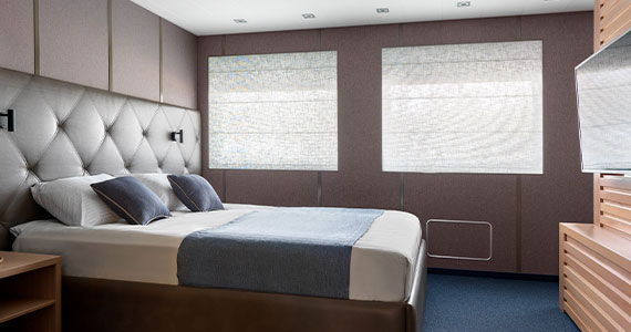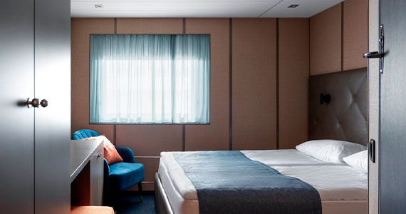 Однокомнатная каюта с удобствами, рассчитанная на размещение до четырех человек. В каюте: двуспальная кровать, диван, кресло, шкаф для одежды, журнальный стол, сейф, телевизор, холодильник, кофемашина, фен, радио, четыре обзорных окна, электророзетка на 220V.