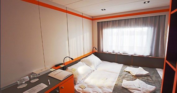 Однокомнатная одноярусная каюта с удобствами, рассчитанная на размещение двух человек. В каюте: двуспальная кровать, холодильник, минибар, сейф, телевизор, шкаф для одежды, радио, обзорное окно, душ, санузел, кондиционер, фен, сейф, электророзетка на 220V.