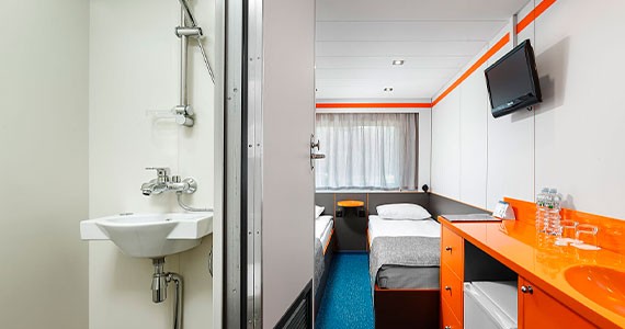 Однокомнатная двухъярусная каюта с удобствами, рассчитанная на размещение до трех человек, площадь каюты до 9 кв.м. В каюте три спальных места (не сдвигаются, верхнее место не складывается), шкаф для одежды, холодильник, минибар, сейф, телевизор, радио, душ, санузел, кондиционер, фен, сейф, два иллюминатора, электророзетка на 220V. Возможна продажа каюты в двухместном одноярусном размещении (по стоимости 2-местной каюты).