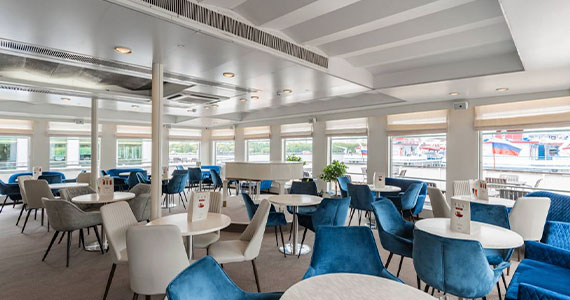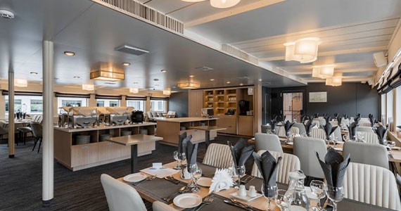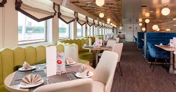 Ресторан работает по системе шведского стола на завтрак и заказного питания на обед и ужин — в первый вечер круиза вам принесут бланк меню на следующий день, где вы сможете сделать выбор из представленных блюд. По запросу вам может быть предоставлено спецпитание: вегетарианское, диетическое и любое другое в соответствии с вашими пожеланиями. С заботой о вашем здоровье мы разработали блюда меньшей калорийности. По многочисленным просьбам гостей мы предоставляем возможность выбора размера порций. Наши повара уделяют особое внимание предпочтениям юных гостей — вы всегда найдёте, чем накормить вашего ребёнка, не сомневаясь в качестве продуктов и соответствии особенностям детского рациона.