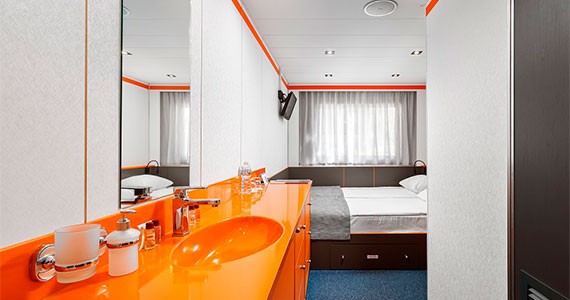 Однокомнатная каюта с удобствами, рассчитанная на размещение одного человека. В каюте: одно спальное место, холодильник, минибар, сейф, телевизор, шкаф для одежды, радио, душ, санузел, кондиционер, обзорное окно, фен, электророзетка на 220V.