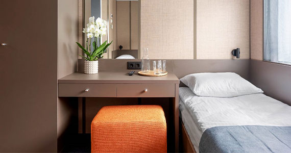 Однокомнатная каюта с удобствами, рассчитанная на размещение до двух человек. В каюте: две односпальные кровати (не сдвигаются), кресло, шкаф для одежды, пуфик, сейф, телевизор, холодильник, радио, обзорное окно, душ (душевая штора из водоотталкивающего материала или душевая стеклянная ширма), санузел, кондиционер, фен, электророзетка на 220V
