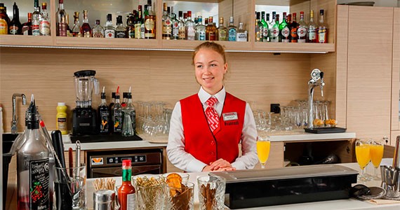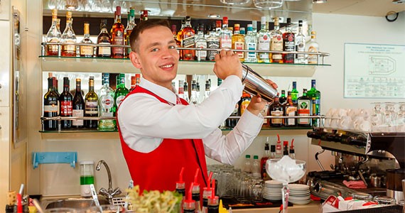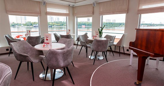 Вечером в баре вы можете узнать последние новости, послушать концерт живой музыки или выступления эстрадных исполнителей, сыграть в мафию или принять участие в тематическом мастер-классе. Всю информацию о планируемых мероприятиях и времени их проведения вы найдёте в программе дня, которая каждый вечер будет доставляться вам в каюту. Бар также работает по системе «A La Carte». При этом, не важно в какое время суток вы проголодались, у вас всегда будет возможность найти что-нибудь вкусное. Не откажите себе в удовольствии попробовать pizza romana или римскую пиццу, которая отличается от классической неаполитанской размерами и начинкой, а также наши фирменные закуски: грилату с начинкой в виде треугольного пирога, которую с обеих сторон обжаривают на гриле, а также круассаны с ветчиной и сыром. В качестве горячего блюда предлагаем попробовать «Креветки магаданские», отварные или обжаренные на ваш выбор.