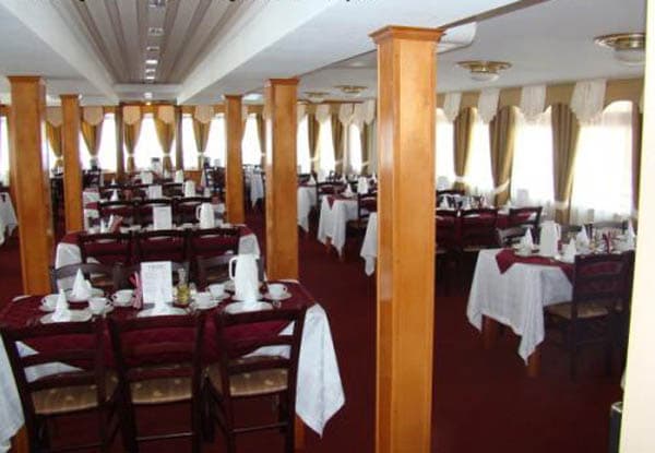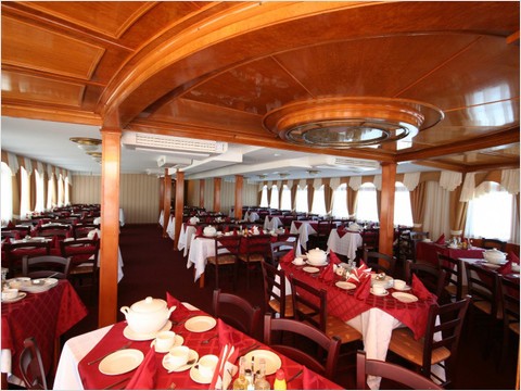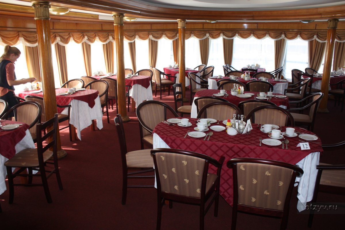 В стоимость круиза на четырехпалубном теплоходе включено трехразовое питание в ресторане: завтрак, обед и ужин по заказному меню. Питание в ресторане осуществляется в две смены. Есть отдельное меню для детей.